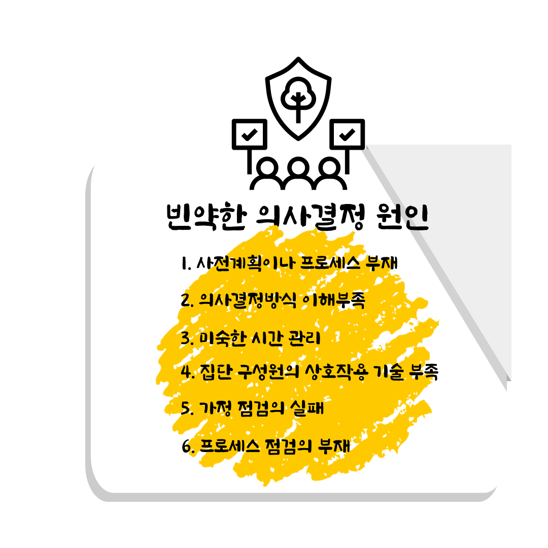 ② 해결방안: 의사결정을 위해 미팅을 할 때에는 사전에 6가지 주요 의사결정 방식에 대해 숙지하고, 어떤 방식을 활용할지 결정해 둘 필요가 있다.