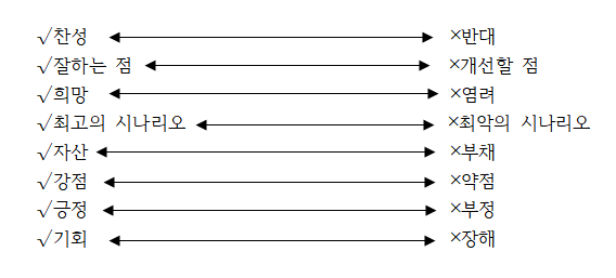 ③ 3단계: 플립차트의 중아에 선을 하나 긋는다. 한 쪽은 목표에 도달하는 데에 도움이 될 만한 모든 힘(자둰, 기술, 태도)을 구분하는데에 활용하고, 다른 한 쪽은 방해가 되는 힘(장해, 방해, 결함)을 구분하는데에 활용한다.
